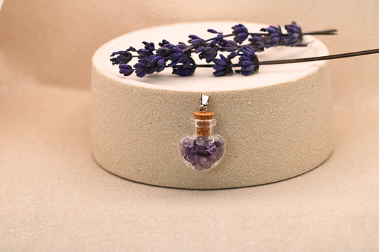 Pendentif Bouteille en Verre avec Pierres de Quartz Rose et Améthyste - Élégance et Énergie